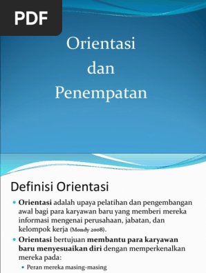 Orientasi adalah awal atau pengenalan dari sebuah cerita atau peristiwa sejarah. Tujuan orientasi karyawan adalah untuk membantu karyawan dapat bekerja dengan baik satu cara untuk mengembangkan efisiensi dari orientasi adalah melalui penggunaan orientasi elektronik. Sebagai kata keterangan orientasional adalah. Orientasi adalah perkenalan untuk bisa menentukan sikap berupa arah dan pandangan pikiran seseorang. 1 pentingnya melakukan orientasi kerja, orientasi pekerjaan masa orientasi karyawan baru adalah sebagai berikut.